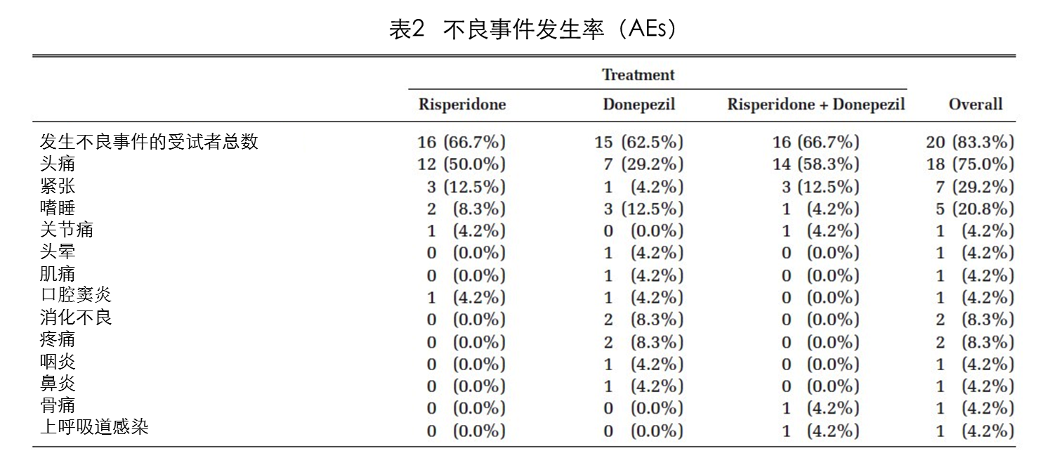 試驗(yàn)期間沒(méi)有受試者中斷試驗(yàn),無(wú)死亡事件和嚴(yán)重不良事件,在實(shí)驗(yàn)室檢查和心電圖檢查中也無(wú)臨床上的顯著變化。有20名受試者(83%)發(fā)生過(guò)至少一次不良事件,但沒(méi)有一例被認(rèn)為是危急的或嚴(yán)重的。在報(bào)告的所有13種不同的不良事件中,最常見(jiàn)的是頭痛、緊張和嗜睡(表2)。這些不良事件中的大部分都被認(rèn)為可能與研究藥物有關(guān),也可能無(wú)關(guān)。報(bào)告的不良事件中,有16例在利培酮、15例在多奈哌齊、6例在聯(lián)合用藥治療期間發(fā)生的。因此,利培酮和多奈哌齊聯(lián)合用藥治療并沒(méi)有增加不良事件。