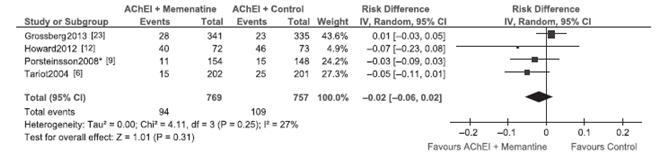 圖5聯(lián)合膽堿酯酶抑制劑加美金剛的治療對比膽堿酯酶抑制劑單獨(dú)治療的嚴(yán)重不良反應(yīng)的薈萃分析結(jié)果。 *分組的中度患者數(shù)據(jù)取自溫布萊德等人的薈萃分析 [28]。 AChEI,乙酰膽堿酯酶抑制劑;標(biāo)準(zhǔn),規(guī)范。