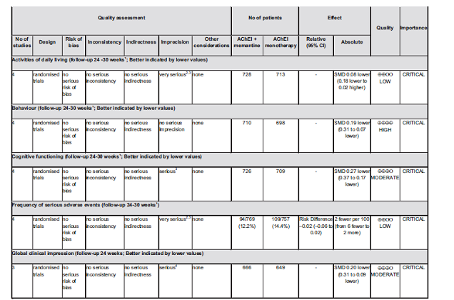 結(jié)果:從包括1549名中重度AD患者的四個(gè)試驗(yàn)數(shù)據(jù)匯總得,與CHEI單一使用相比,兩藥的聯(lián)合應(yīng)用顯著提高GCI [標(biāo)準(zhǔn)化均差(SMD)0.20; 95%置信區(qū)間(CI)0.31; 0.09],改善認(rèn)知功能(SMD 0.27,95%CI 0.37;0.17)并改善行為(SMD 0.19; 95%CI 0.31;0.07)。確鑿的證據(jù)顯示是對行為的影響最高,對認(rèn)知功能和GCI的影響程度居中,對ADL的影響最低。在第二輪的研究之后,小組成員的觀點(diǎn)達(dá)成共識。我們所期望的CHEI和美金剛聯(lián)合應(yīng)用的效果被認(rèn)為高于不期望的效果。但由于二者聯(lián)合使用對認(rèn)知,GCI和ADL的效果缺乏有力的證據(jù),使得這一聯(lián)合療法在廣大推薦指南中并未被推廣。