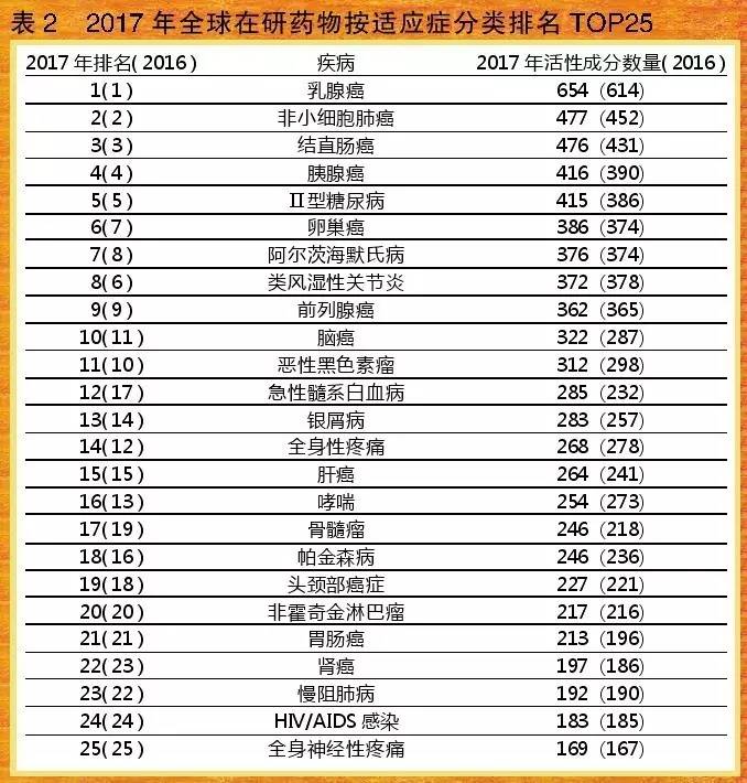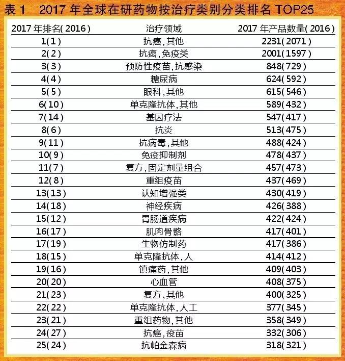 從治療類別TOP 25排名中發(fā)現,一般抗癌藥(在研藥物2231個)、免疫類抗癌藥(2001個)、抗感染預防性疫苗(848個)、糖尿病治療藥物(624個)、其他眼科用藥(615個)為排名居前五位的治療類別,該排名順序與2015和2016年順序一致。
