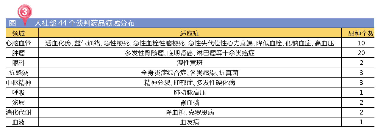 從表3可以看到,人社部談判品種主要是針對大病重病,腫瘤和心血管治療藥物比例很高,談判品種也符合醫(yī)保目錄鼓勵競爭的特征,同適應癥品種未進醫(yī)保的盡可能納入談判。