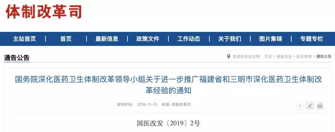 11月15日,國務(wù)院深化醫(yī)藥衛(wèi)生體制改革領(lǐng)導(dǎo)小組下發(fā)《關(guān)于進(jìn)一步推廣福建省和三明市深化醫(yī)藥衛(wèi)生體制改革經(jīng)驗的通知》(以下簡稱“通知”)釋放重大信號。