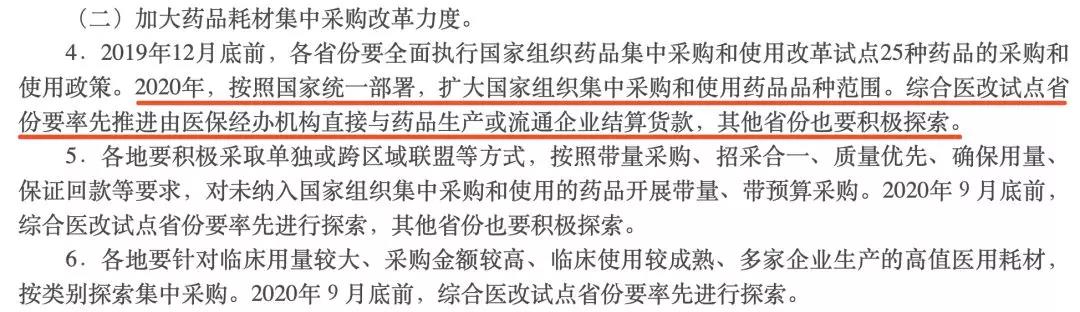 2020年,按照國家統(tǒng)一部署,擴(kuò)大國家組織集中采購和使用藥品品種范圍。綜合醫(yī)改試點省份要率先推進(jìn)由醫(yī)保經(jīng)辦機(jī)構(gòu)直接與藥品生產(chǎn)或流通企業(yè)結(jié)算貨款,其他省份也要積極探索。