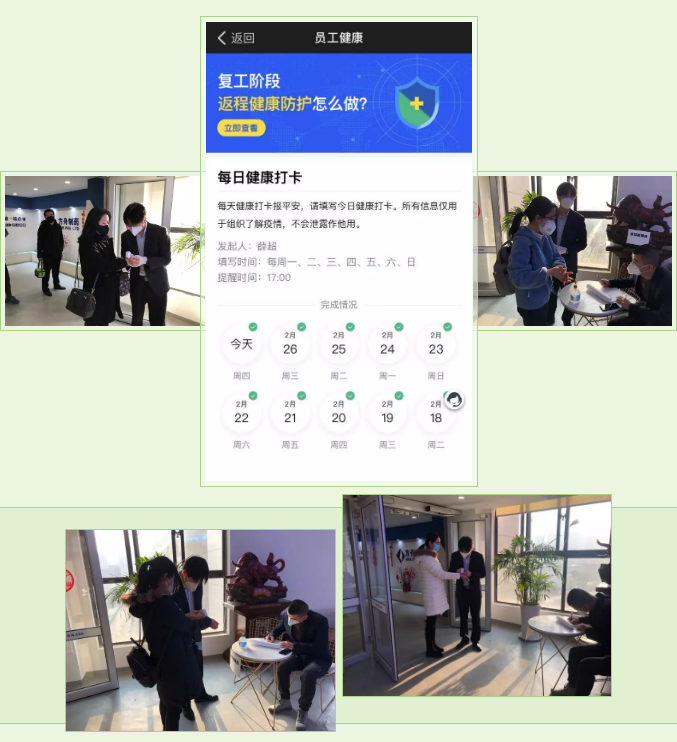 1. 員工仍需每日在釘釘APP進行健康打卡報平安,進入公司時,都需要進行體溫測量及登記,測量體溫不高于37.2°C后,再用酒精凝膠進行消毒后才可入內(nèi)工作;